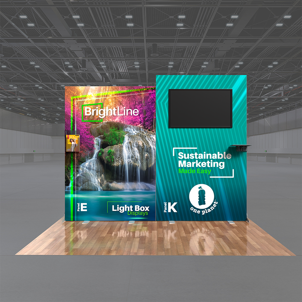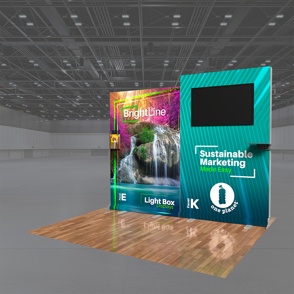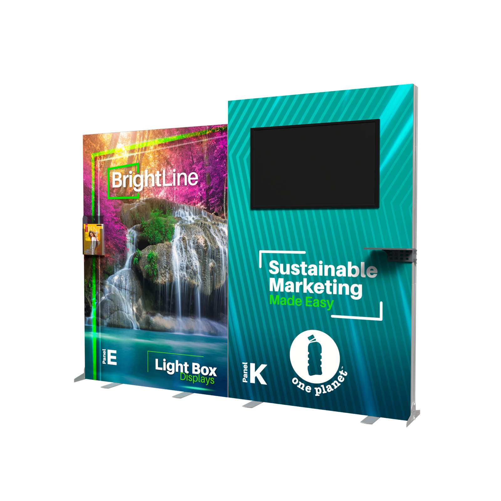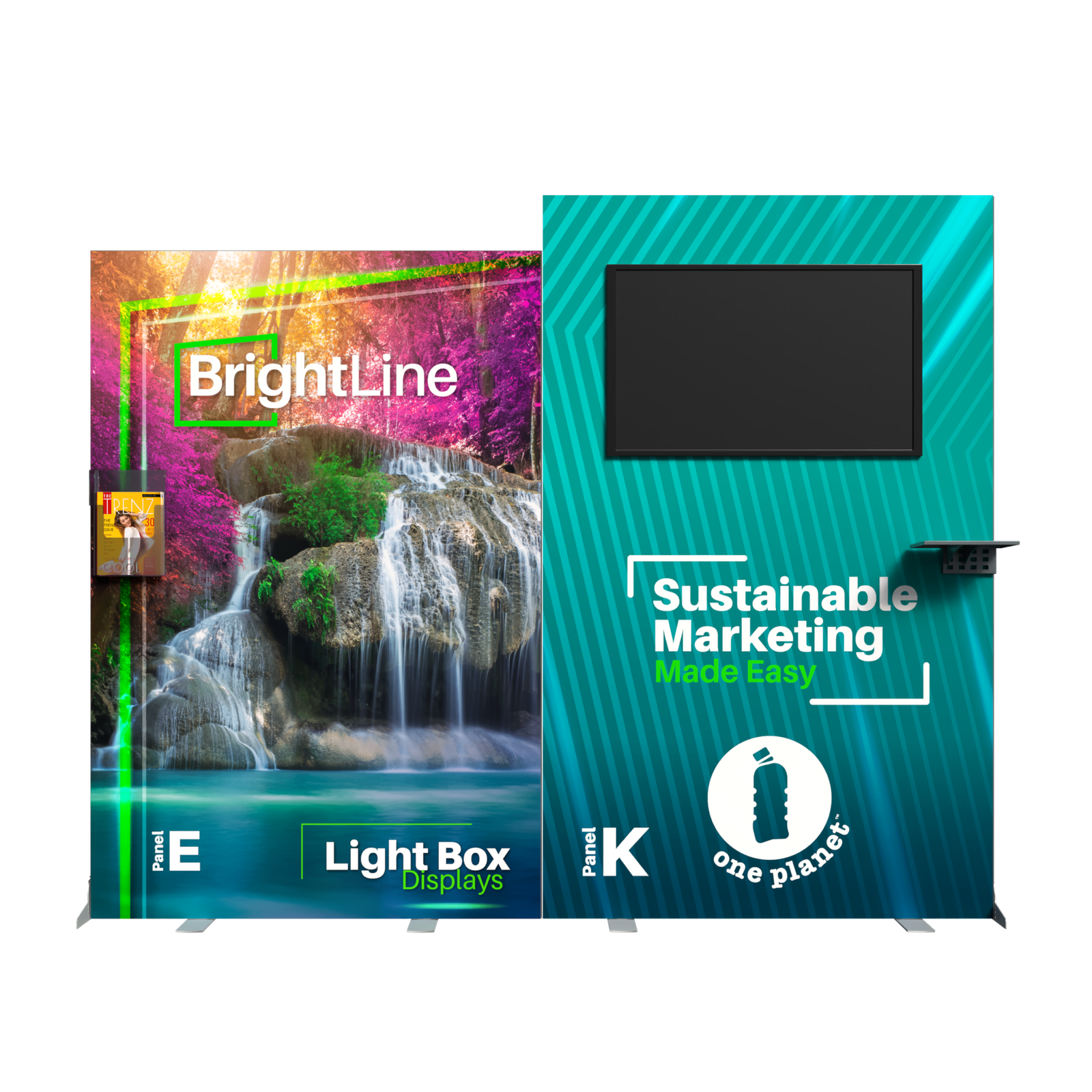 BrightLine Kits engage audiences with illuminated displays combining shapes and styles to create captivating exhibits. Kits include hardware, graphics, connectors, and extension cables to reach a single power source location. Each panel is packed in a custom-foamed shipping case. The 10-EK Kit packs double-duty as a 10ft exhibit or two individual 5ft displays. By combining two distinct heights, this design achieves an eye-catching movement that compliments any branding. Elevate the branding experience with double-sided graphics, or adding accessories like