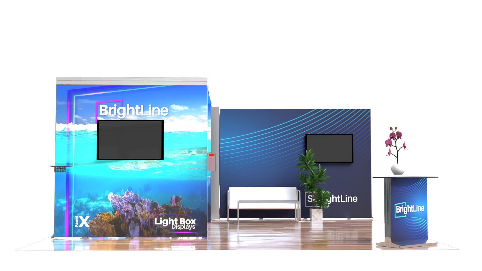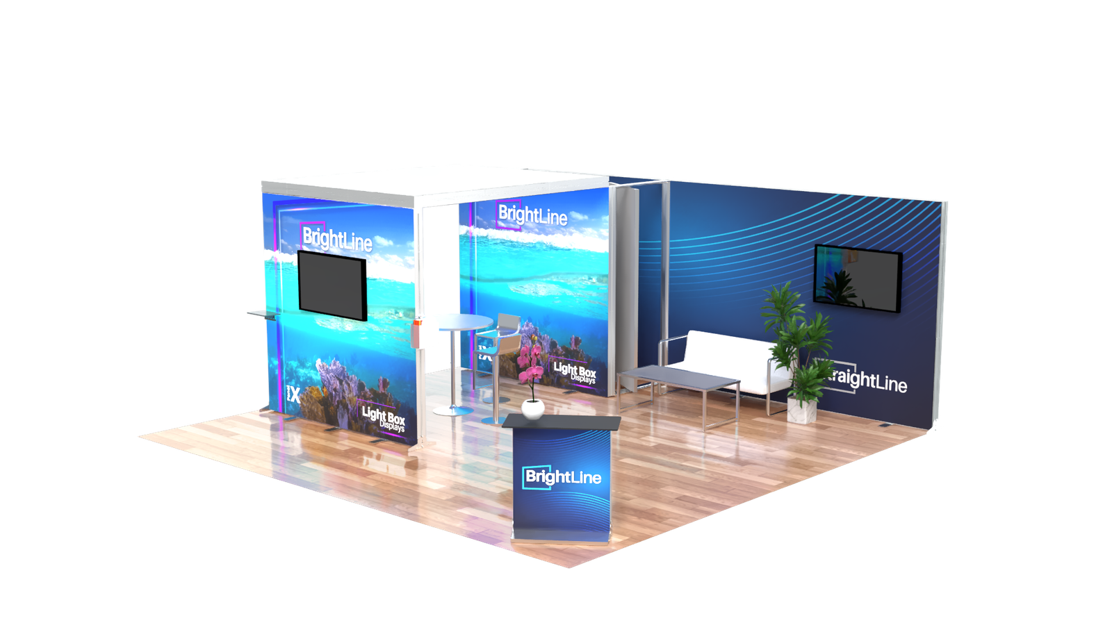 The BrightLine Island Kit 2 is ideal to create an eye-catching and functional 20ft island booth. This kit includes a distinctive backlit 10ft x 10ft arch that forms a cozy meeting space, fully branded from walls to ceiling. Flanking at the back of the booth, an impressive 20ft StraightLine wall provides a bold branding opportunity. Two StraightLine J Panels are strategically placed between these two elements to create a convenient storage area. An illuminated counter serves as a welcome point, inviting clients into an open space perfect for product activations or lounge areas, ideal for engaging with visitors in a professional and comfortable setting. The kit also includes two TV monitor kits for dynamic video presentations.