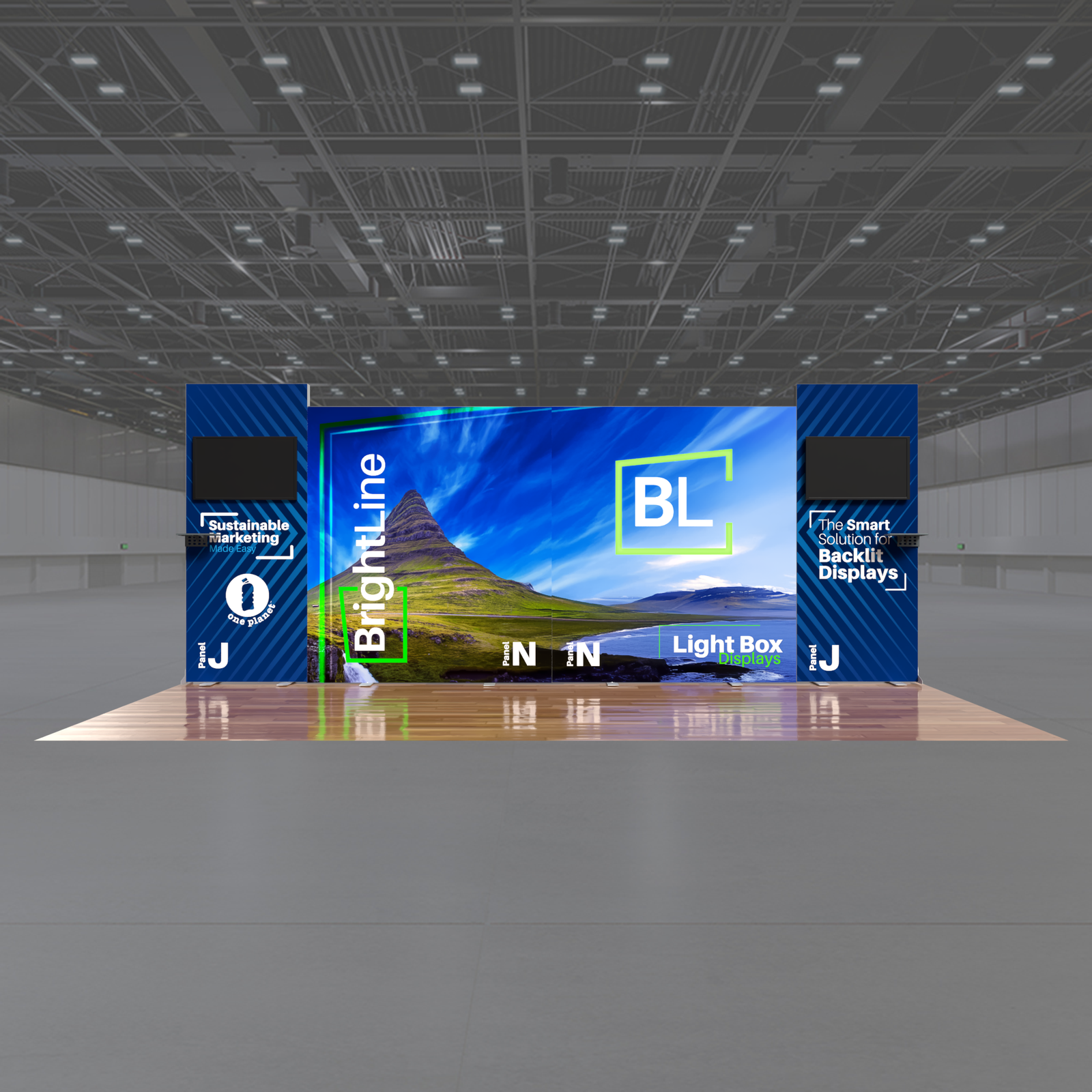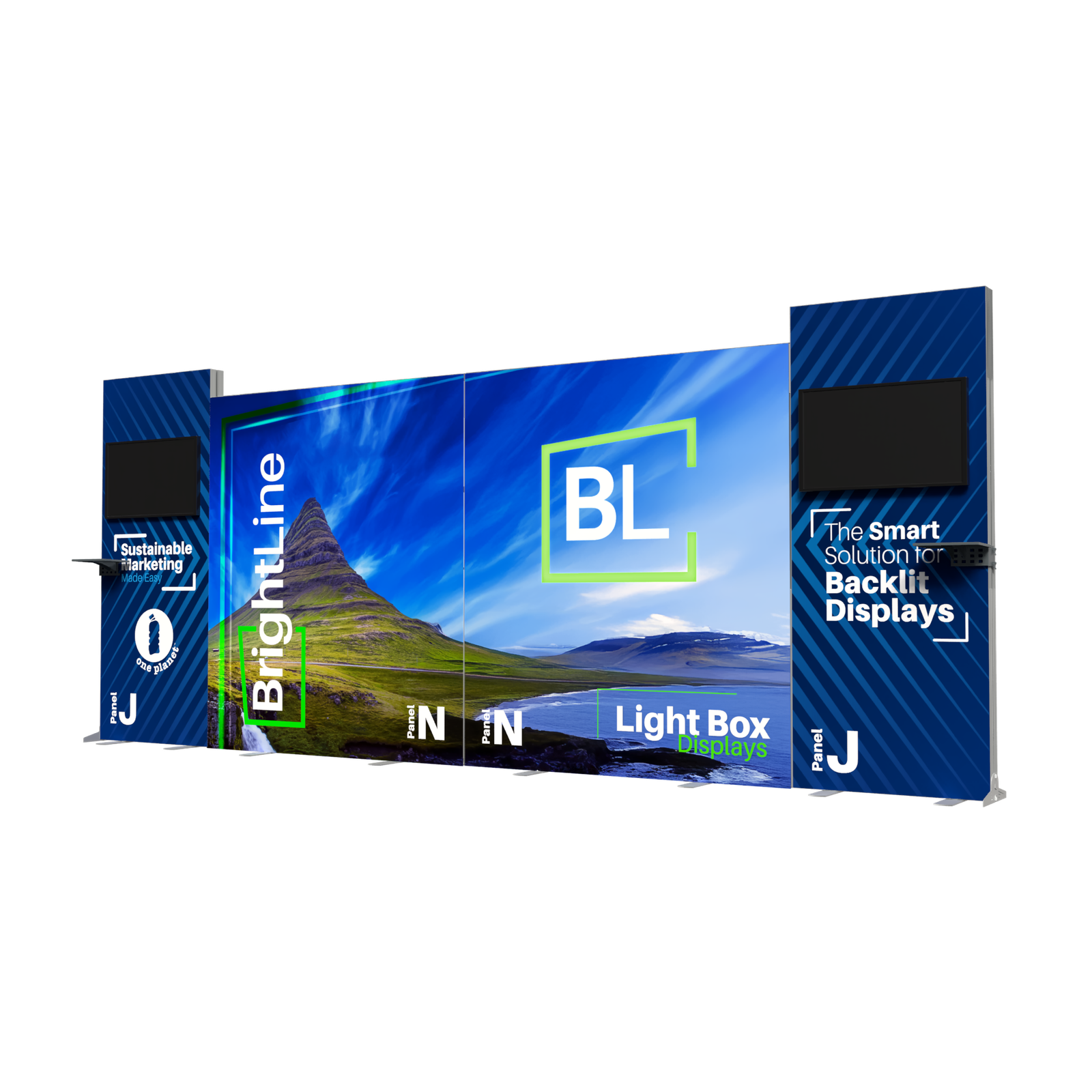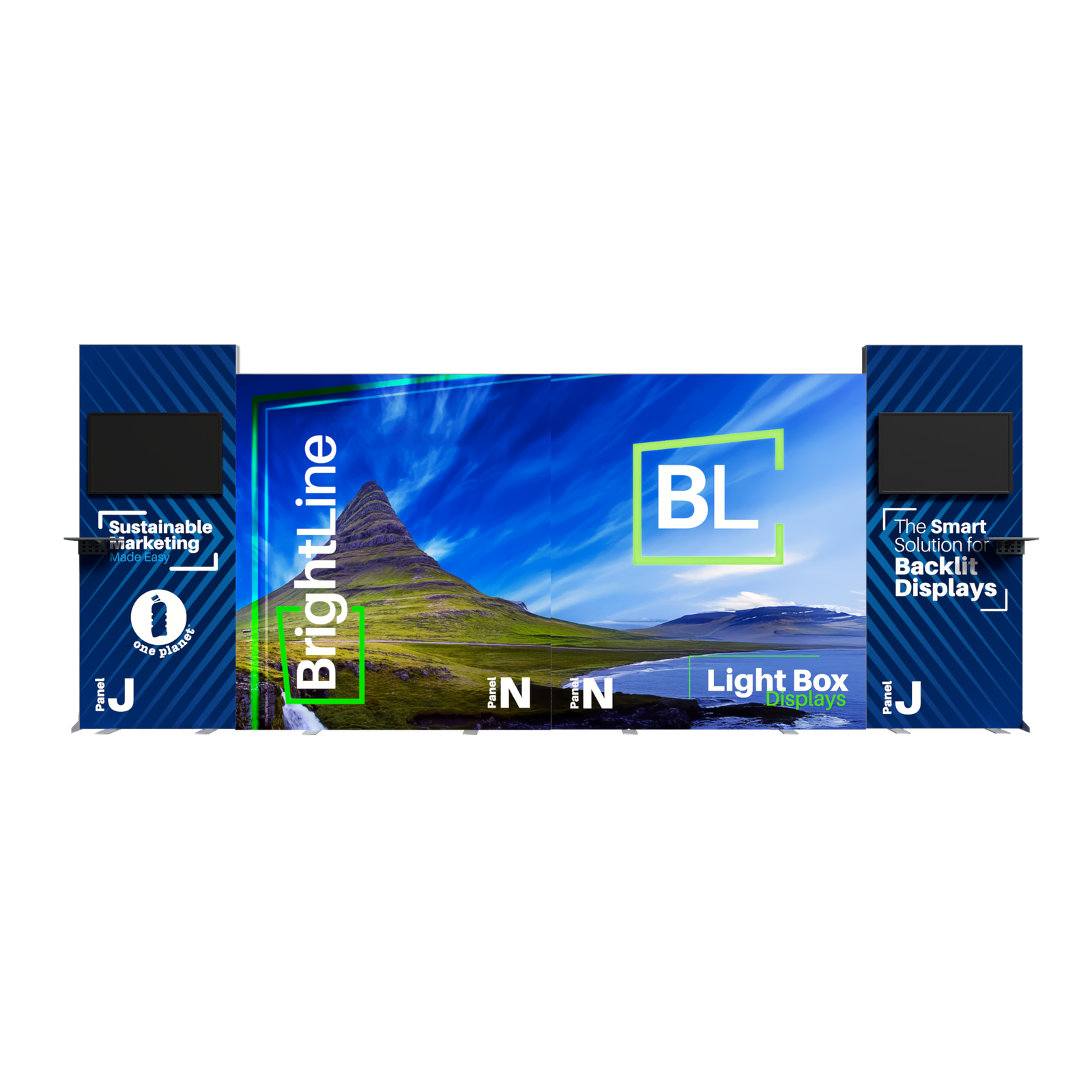 BrightLine Kits engage audiences with illuminated displays combining shapes and styles to create captivating exhibits. Kits include hardware, graphics, connectors, and extension cables to reach a single power source location. Each panel is packed in a custom-foamed shipping case. The 20-JNNJ kit showcases a dynamic contrast, with wide N panels paired with tall and slender J banners. This convertible booth turns into two identical 10ft displays. Elevate the branding experience with double-sided graphics, or adding accessories like