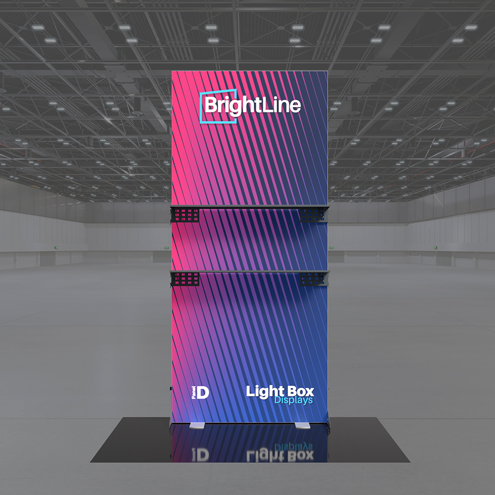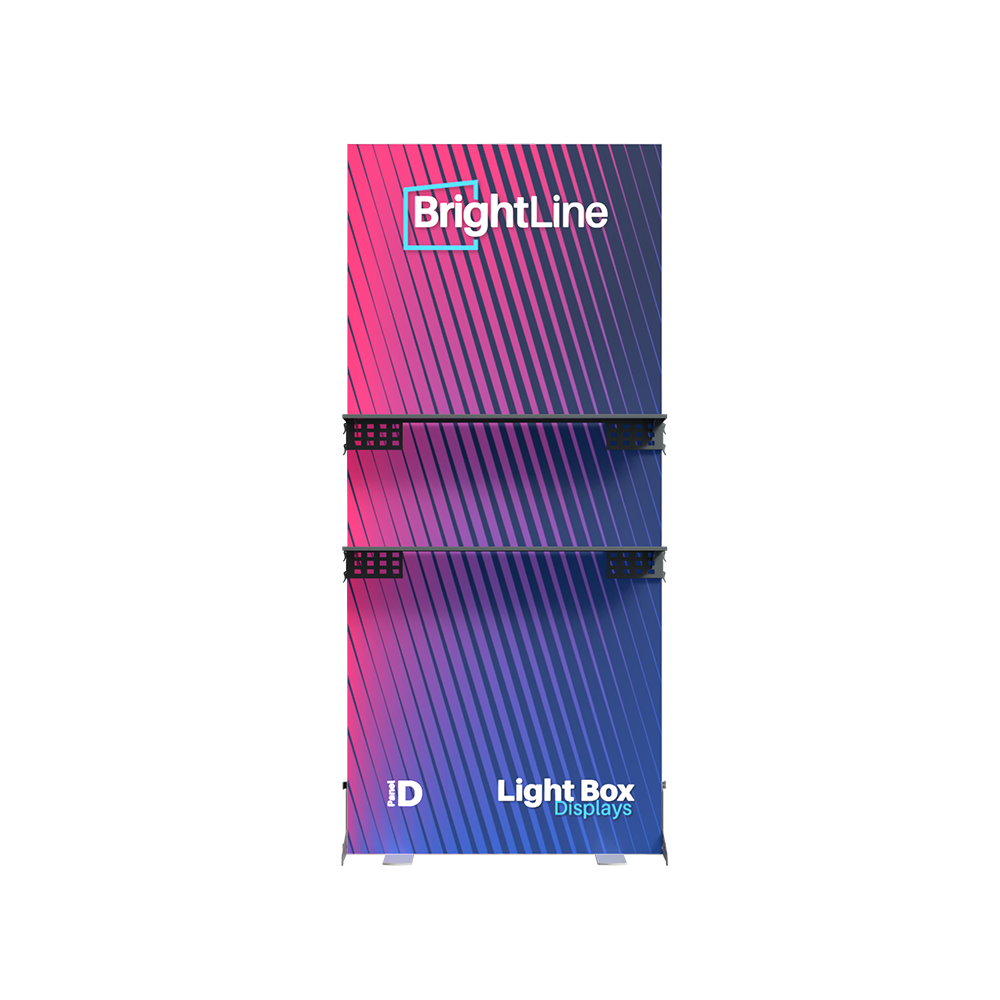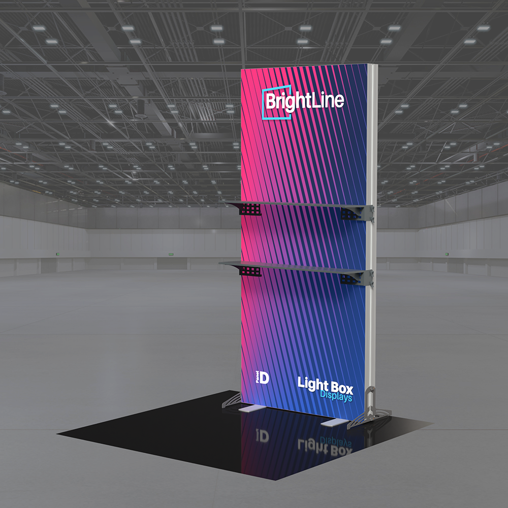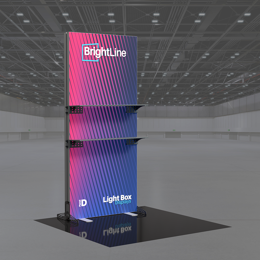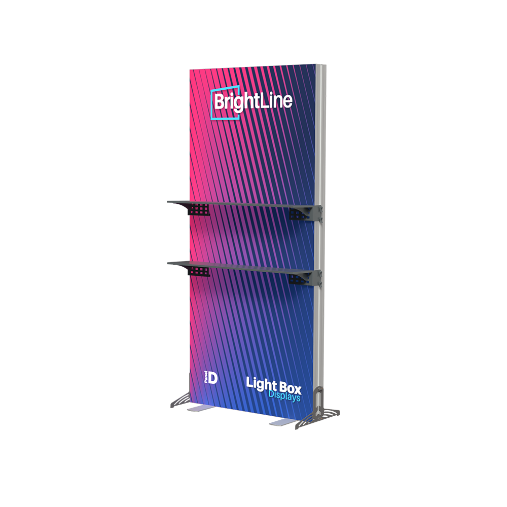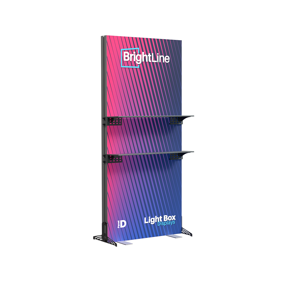 BrightLine Kits engage audiences with illuminated displays combining shapes and styles to create captivating exhibits. Kits include hardware, graphics, connectors, and extension cables to reach a single power source location. Each panel is packed in a custom-foamed shipping case. This kit takes the versatile Panel D and enhances it with two attachable shelves, turning it into a functional showcase for products, samples, and easy-access materials. Elevate the branding experience with double-sided graphics, or adding accessories like