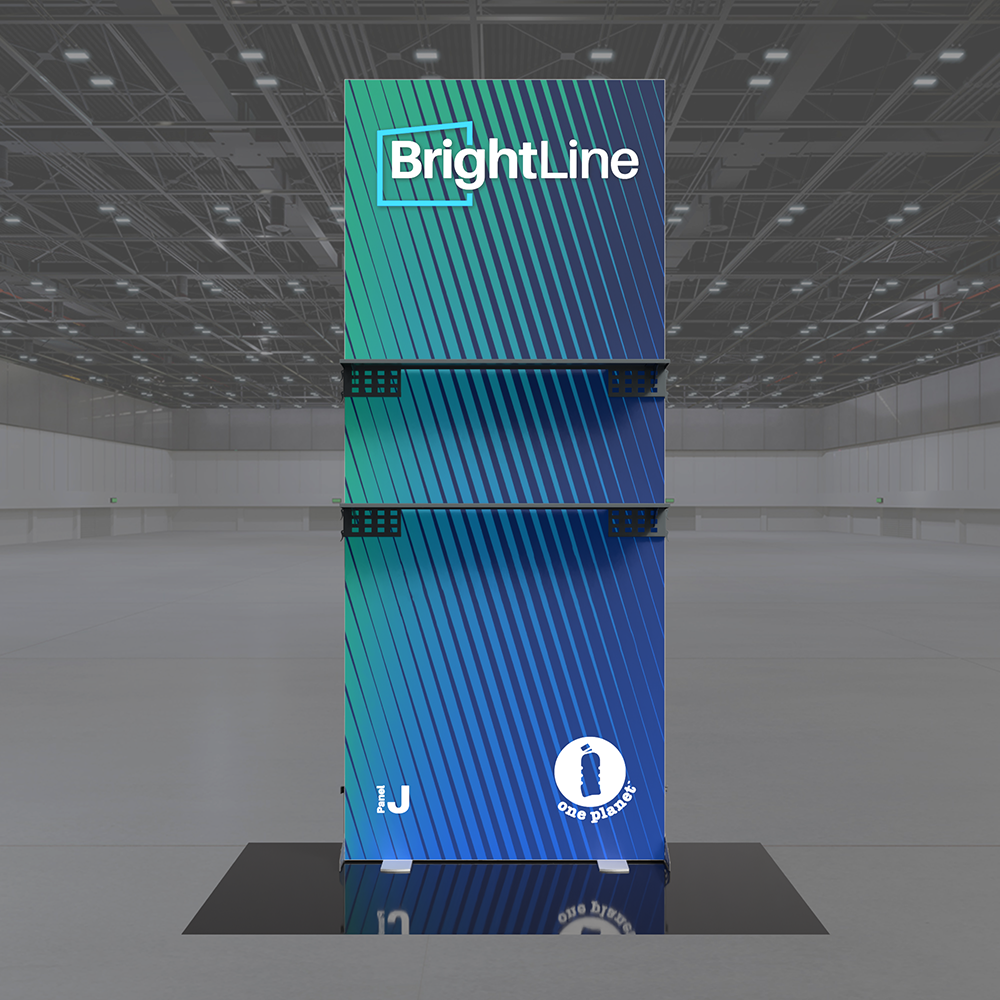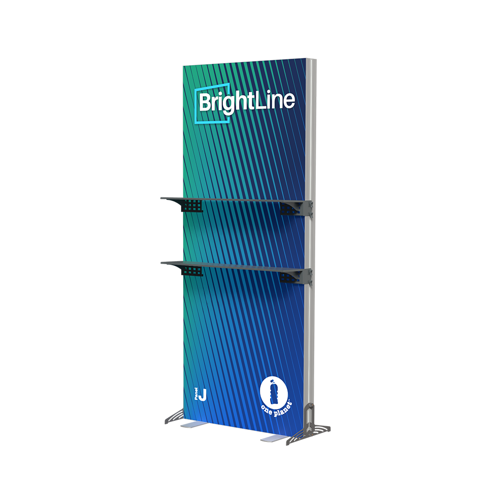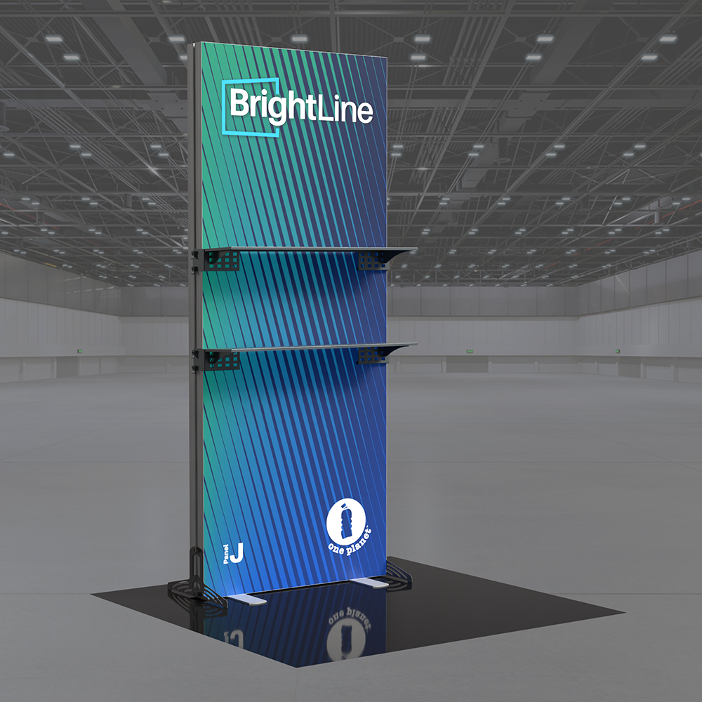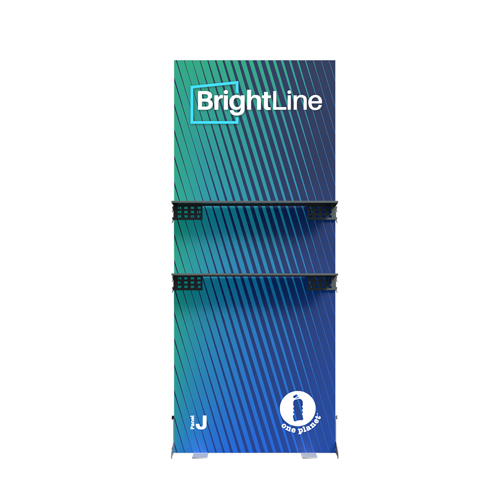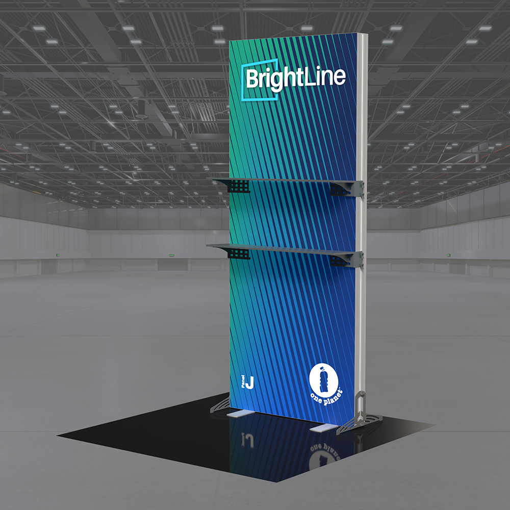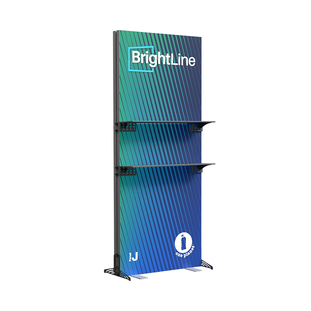 BrightLine Kits engage audiences with illuminated displays combining shapes and styles to create captivating exhibits. Kits include hardware, graphics, connectors, and extension cables to reach a single power source location. Each panel is packed in a custom-foamed shipping case. The Panel J Shelving kit transforms the panel J with the addition of two attachable shelves, creating a polished, ready-to-showcase station for products, samples, and featured materials. Elevate the branding experience with double-sided graphics, or adding accessories like